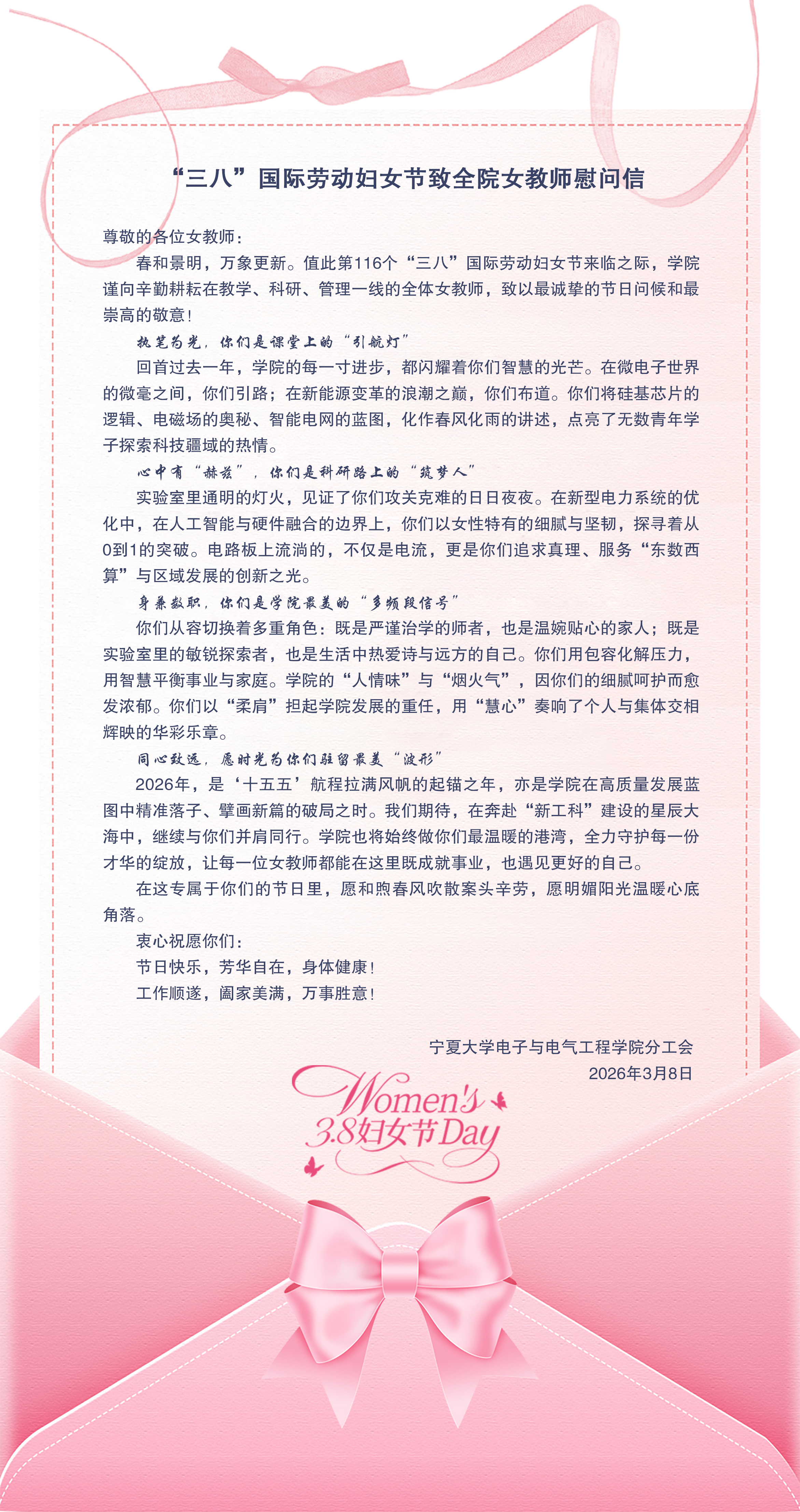 “三八”国际劳动妇女节致全院女教师慰问信